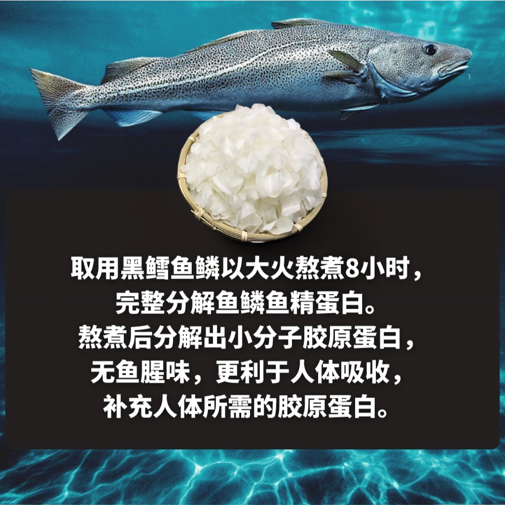 Sourced from premium deep-sea black cod, packed with small-molecule collagen peptides for better absorption—boost skin elasticity, firmness, and smooth fine lines for a radiant, youthful glow.