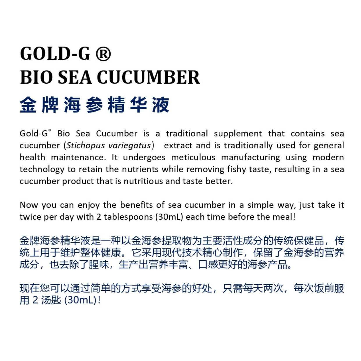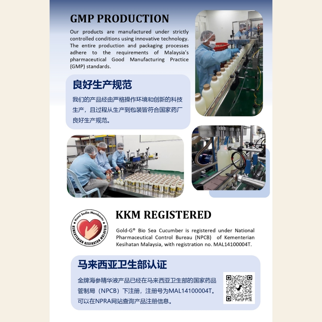 GNE Gold-G 海参精华是来自印尼原生态深海的黄金海参(Stichopus variegatus)提取物,富含活性胶原蛋白、黏多糖、维生素和矿物质,能有效促进身体修复、增强免疫力、缓解炎症,是日常调养与康复的理想选择。